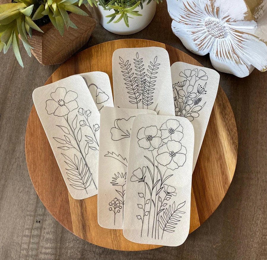 Introducing the Water Soluble Floral Embroidery Template! This little gem will revolutionize your DIY embroidery projects. Say goodbye to those pesky transfer patterns and hello to easy breezy stitching. Stick and Stitch patches are the name of the game when it comes to this template. No need to fuss with patterns any longer, just tear off the backing and stick it to your project area. Then, start stitching! When you're finished, soak or rinse the paper away with warm water, gently rub away any remaining bits, and let it dry. Voila! You're left with a gorgeous, personalized embroidery piece.