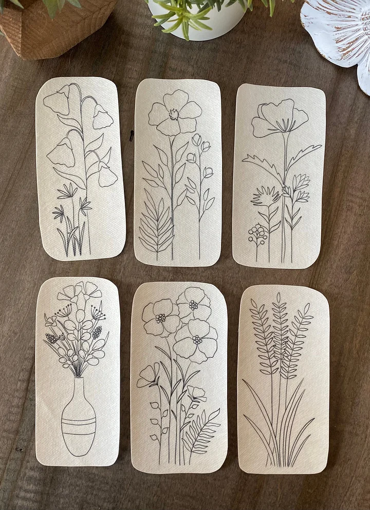 【6 PCS】Water Soluble Tall & Skinny Flowers Embroidery Pattern,peel and stick paper for ornaments