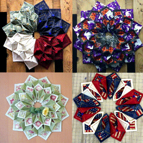 This is a quick and fun project. A little stitching, some folding and you’ll have an unusual three dimensional wreath for a door, wall or table. Add some beads for sparkle, if you wish.