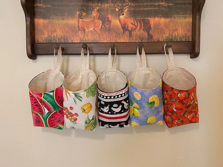 They're perfect to hold whatever bits & bobs that you have. Create a batch for your kitchen, sewing room, car, garage, bathroom, bedrooms, etc. to hold all of your favorite tools and items. Hang these from a peg board or Command Strips with a sewn on loop. Or add a snap or velcro on one side of the loop so you can easily hang or remove from difficult areas like your car headrest or shower pole.