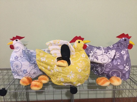 Made from quilted fabric, these colorful and funky chicks are a delightful addition to any table! It has become a tradition to serve it at Thanksgiving and Christmas dinners.